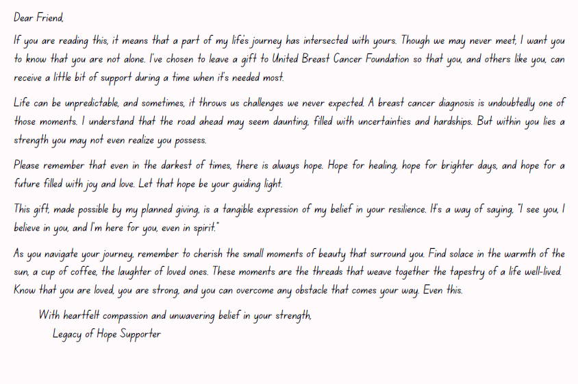 When you include United Breast Cancer Foundation in your estate plans or make planned gifts, you become a valued member of our Legacy of Hope community. This special group comprises forward-thinking individuals who have made a commitment to securing the future of UBCF's mission - to make a positive difference in the lives of those affected by breast cancer - and ensuring our vital services, like UBCF's Individual Grant Program, remain available beyond your lifetime.