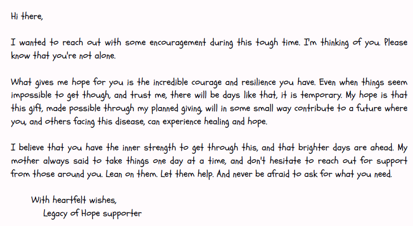 As a meaningful way to extend your legacy beyond a financial gift, we invite you to write a letter of encouragement to future program recipients. This letter will be shared with the individuals your contribution has directly helped, allowing your words of hope and support to live on. Your letter is more than just words; it's a powerful source of emotional support during a very challenging time. It's an opportunity to share your wisdom, life lessons, and offer a personal connection that can mean the world to someone facing breast cancer treatment. These letters provide invaluable comfort and strength, reminding recipients they are not alone. |